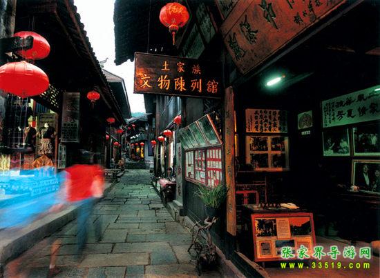 拾級(jí)而上,山路一般的陡峭。從碼頭開始綿亙而上的石階,那是一條長達(dá)五里貫穿古鎮(zhèn)的青石板路,它沒有名字,于是人們就直接管它叫五里長街。踏上古街,似乎踩在被悠長歲月遺落的碎片上面。不知不覺走到掛有“土家觀瀑吊腳樓”牌匾的民俗博物館前,從手搖腳踏的棉花機(jī)、閹豬鳴號(hào)的羊角到世代相傳的雕花牙床,近百件散發(fā)著鄉(xiāng)土氣息的民間用具,展示著土家族古老豐富的歷史??醋o(hù)人說,這是一位土家族年輕人爬山涉水收集來的,靜靜地訴說著這個(gè)小村古老的過去。這棟三層的小樓,一半落在河岸上,另一半?yún)s是由水泥柱支撐著,水泥柱直插河底,任水流日日夜夜地沖刷,小小的吊腳樓仍穩(wěn)穩(wěn)當(dāng)當(dāng)站在那里,任憑時(shí)間的流逝。好聰明的土家人,巧借一片水面,竟建起了如此妖嬈的住房。