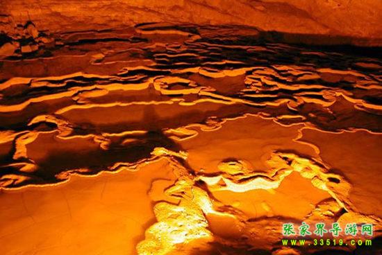 “黃‘龍’之水天上來”,這里洞頂與外界僅一層薄薄的巖石相隔,天上雨水匯集起來滲透巖層便形成黃龍洞內(nèi)流量最大的一股泉水——天仙水,其落差達(dá)27.3米。“飛流直下三千尺,疑是銀河落九天”,誰能想象洞中竟有這樣雄偉壯觀的瀑布?天仙水下面是層層疊疊的石梯田,連綿起伏,有人說這是龍王爺?shù)娜f頃良田。
