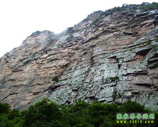 位于插旗峪正中右側(cè)。一石壁從溪邊橫空而起,頂天立地,高約300米,長約800米。仰望崖壁欲墜,通壁無掛,醫(yī)理清晰,棱角分明,強(qiáng)健雄渾,銳不可擋。壁前一谷攔泡,空靈清幽。又岸數(shù)峰相對(duì),俯首揖拜。立于板栗山山頂繚望,此堅(jiān)如一孺獸,昂首夾尾,豪氣奪人。