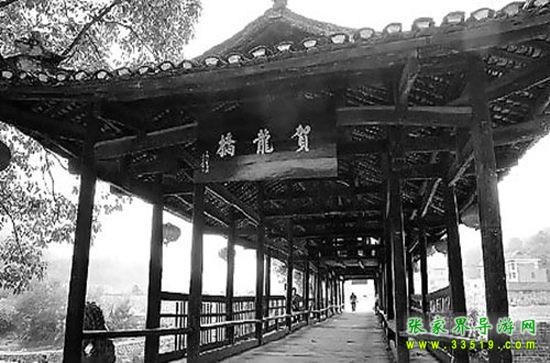 賀龍橋原稱“永安橋”。飛架于賀龍故居右側玉泉河上,是一座石墩、木粱、騎廊的風花橋。東西長40米、寬7米、高8米。龍爪翹檐,中聳堡亭,8尊石獅,分置橋頭及石墩之上,造型渾厚古樸,富有民族特色。此橋原是溝通桑植內外半縣的必經(jīng)之道,是上川鄂下津澧的要津,也是當年鹽局奪槍、桑植起義的發(fā)端處。系賀龍曾祖父賀廷宰首倡捐資修建,幾番修而復圮。至1916年,終由賀龍父親賀仕道襄修告竣。1929年冬,桑植“剿共”司令陳策勛,謂以破“賀氏風水”,令毀此橋。解放后,桑植縣人民政府于1952年冬按原樣復修,命名“賀龍橋”。“文化大革命”動亂中,林彪、“四人幫”誣陷賀龍,指使“紅衛(wèi)兵”毀橋,群眾奮起護衛(wèi),才幸免劫難。1983年5月,賀帥女兒賀曉明應縣政府請求,得全國書法家協(xié)會秘書長謝德萍書匾“賀龍橋”,高懸橋之東西首,永志紀念。1978年,賀龍故居及其生平業(yè)績陳列室、賀龍橋,列為省級重點文物保護單位。凡到賀龍故居、賀龍紀念館的游客這是必經(jīng)之地。