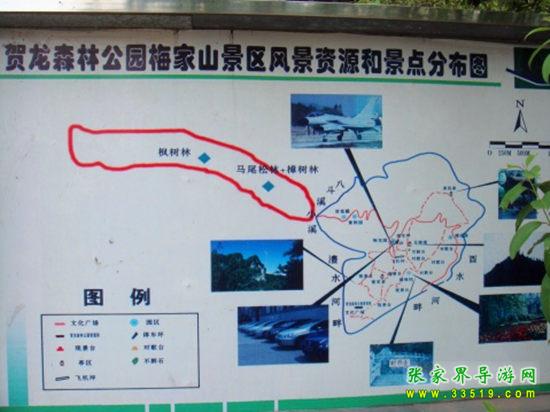 位于桑植縣城北門橋頭的澧水河畔。1929年7月,紅四軍軍長賀龍,在此山腰,設立指揮所,巧布空城計,誘殲“圍剿”司令向子榮部兩千余人于赤溪河中,史稱“赤溪大捷”。自此,梅家山更聞名遐邇,常有人登臨其上,遠眺山川勝勢,緬懷革命先烈偉績。50年代后,縣軍事體育部門,先后在指揮所舊址下側建修靶場,培訓民兵的運動健兒。1984年春,縣有關部門劃出29公頃山地,建立園林公園。