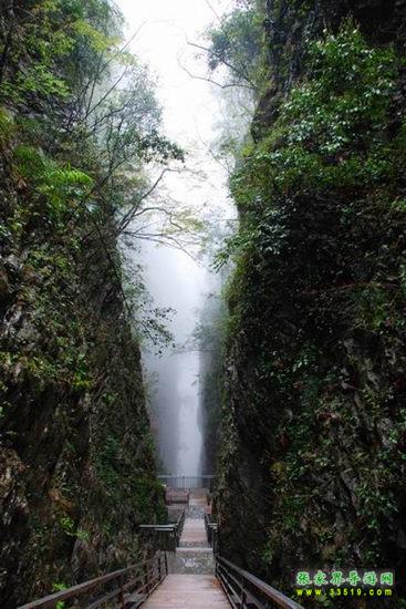 【神泉峽】有請各位朋友注意,我們行走到這里,您會發(fā)現(xiàn),峽谷在這一段猛然一下子收縮了,變得越來越窄了。這段很窄的峽谷叫做神泉峽,總長300余米。在神泉峽,我們要穿過兩處水簾瀑,請大家保護好自己的攝像機、照相機等貴重物品,以免打濕受損。同時還要注意腳下,慢慢行走,因為這一段的木板棧道很滑。
