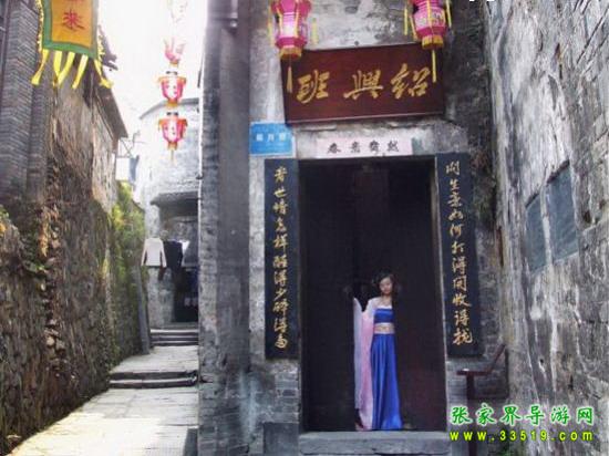 紹興班,位于余家沖,系清代青樓。 始建于清咸豐末年(1860年),是一座四周用封火墻圍護(hù)的木質(zhì)穿斗式的結(jié)構(gòu)建筑,單檐重層,兩進(jìn)三層,各層樓道封閉,分隔有致。各房間置有暗門。具有極其隱蔽的行業(yè)特征。面闊較寬。有濕天井和干天井兩個。通風(fēng)采光效果較佳。木窗均有雕花,且式樣各異。地面分別用青石板和杉木板鋪就,房間屋面均用洪油漆刷,整體形態(tài)完好。近作局部保護(hù)性維修;增添了相關(guān)實(shí)物布置和表演節(jié)目,對游客開放。