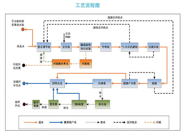 本公司采用預處理+二級反滲透+DM裝置技術(shù)+低溫高效蒸發(fā)工藝。 該工藝集技術(shù)性、可靠性、環(huán)保性、經(jīng)濟性為一體,與其它工藝更 具有優(yōu)勢成為目前成熟的工業(yè)水處理技術(shù)之一。