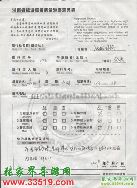 2009年7月31日北京許先生一行18人接待質量反饋單: