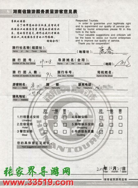 2009年10月18日唐先生一行9人接待質量反饋單: