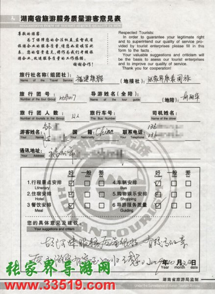 2009年10月17日福州鄒先生一行12人接待質(zhì)量反饋單: