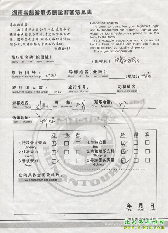 2009年7月22日浙江周先生一行10人接待質量反饋單: