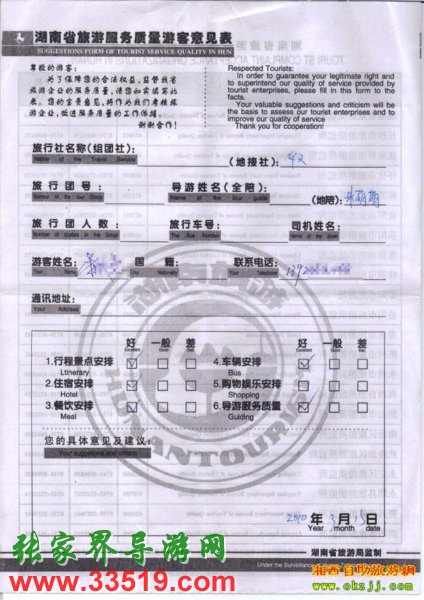 2010年3月15日李先生一行張家界旅游質(zhì)量反饋