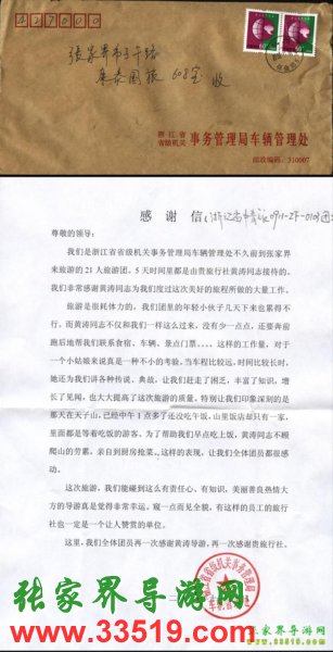 浙江省省級機關(guān)事務(wù)管理局車輛管理處致張家界康泰國旅導(dǎo)游黃濤感謝信