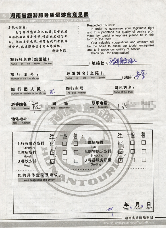 2009年11月11日陳先生一行8人旅游接待質(zhì)量反饋單:
