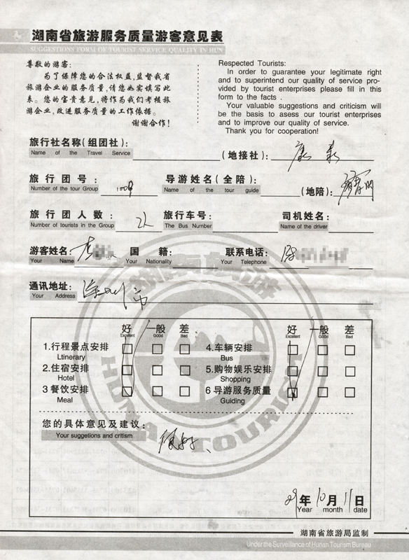 2009年10月9日深圳李先生一行2人質(zhì)量接待反饋單: