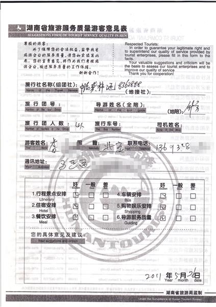 2011年5月26日李先生一行4人旅游質(zhì)量反饋