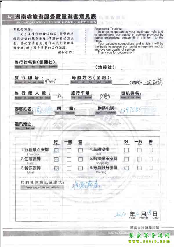 2010年10月18日周先生一行5位旅游質(zhì)量反饋:非常滿(mǎn)意