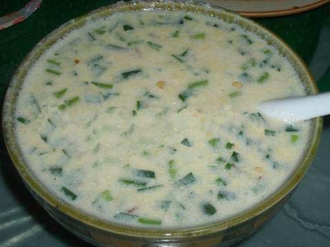 將用水浸泡過的黃豆用磨子磨碎,摻入切細(xì)的青菜葉,然后用溫火煮熟即可。此樣菜雖做法簡(jiǎn)單,但營(yíng)養(yǎng)價(jià)值極高且味鮮美,為當(dāng)?shù)厝顺S玫囊坏啦恕?/p>